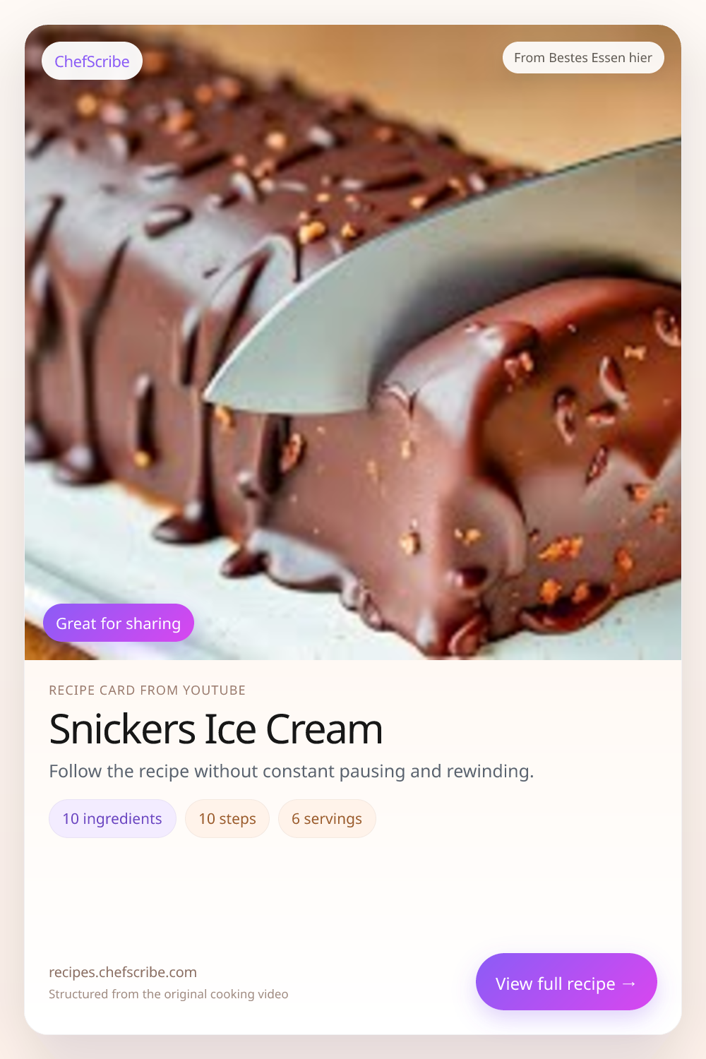 Snickers Ice Cream is shown here as a structured recipe card extracted by ChefScribe from the original YouTube cooking video by Bestes Essen hier. It is designed to make the recipe easier to follow while cooking. For the creator’s full presentation and context, watch the original video on YouTube.