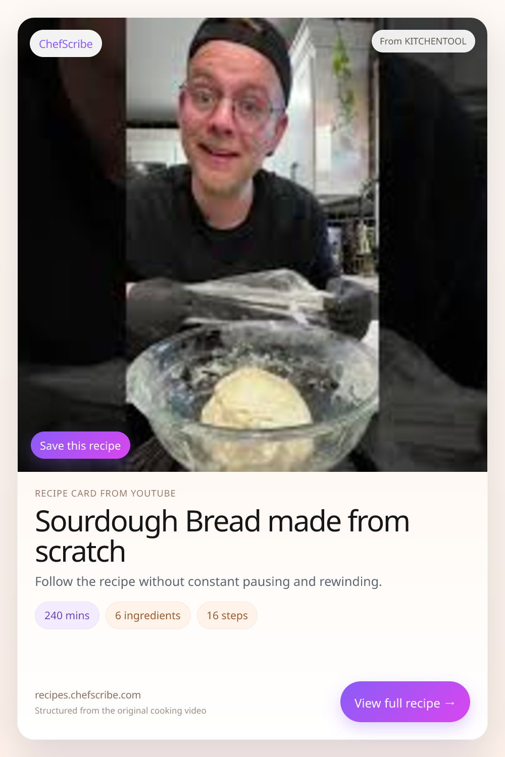 Sourdough Bread made from scratch is shown here as a structured recipe card extracted by ChefScribe from the original YouTube cooking video by KITCHENTOOL. It is designed to make the recipe easier to follow while cooking. For the creator’s full presentation and context, watch the original video on YouTube.