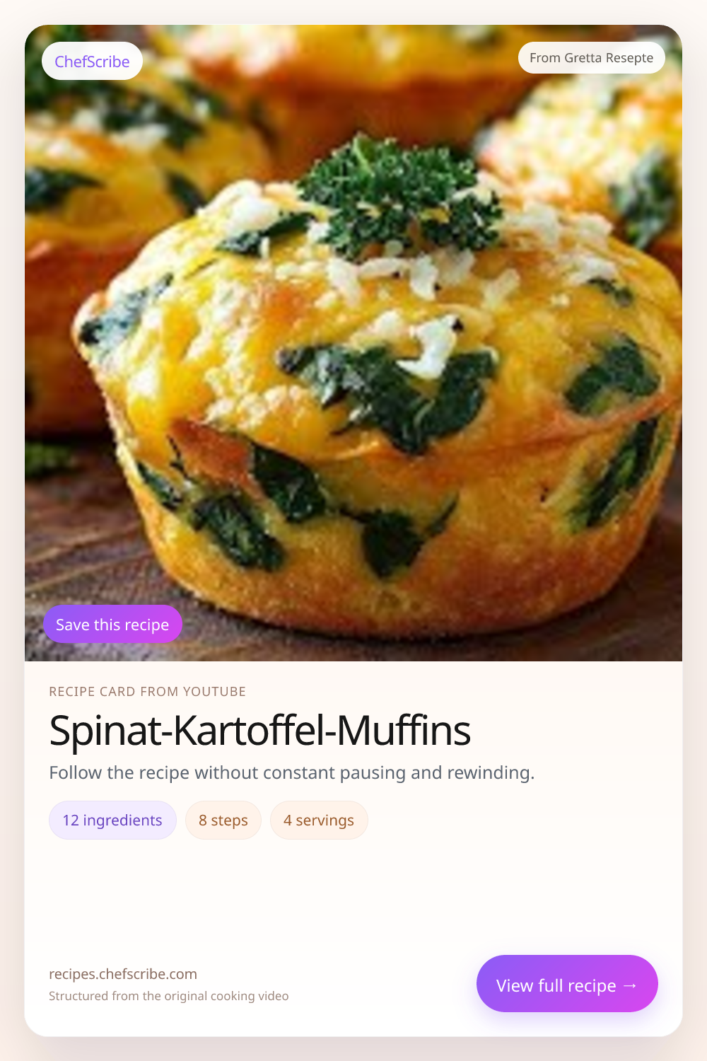 Spinat-Kartoffel-Muffins is shown here as a structured recipe card extracted by ChefScribe from the original YouTube cooking video by Gretta Resepte. It is designed to make the recipe easier to follow while cooking. For the creator’s full presentation and context, watch the original video on YouTube.