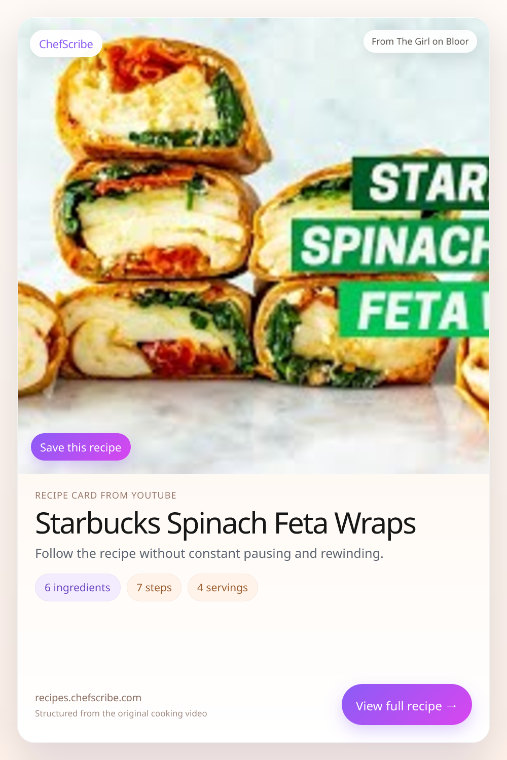 Starbucks Spinach Feta Wraps is shown here as a structured recipe card extracted by ChefScribe from the original YouTube cooking video by The Girl on Bloor. It is designed to make the recipe easier to follow while cooking. For the creator’s full presentation and context, watch the original video on YouTube.