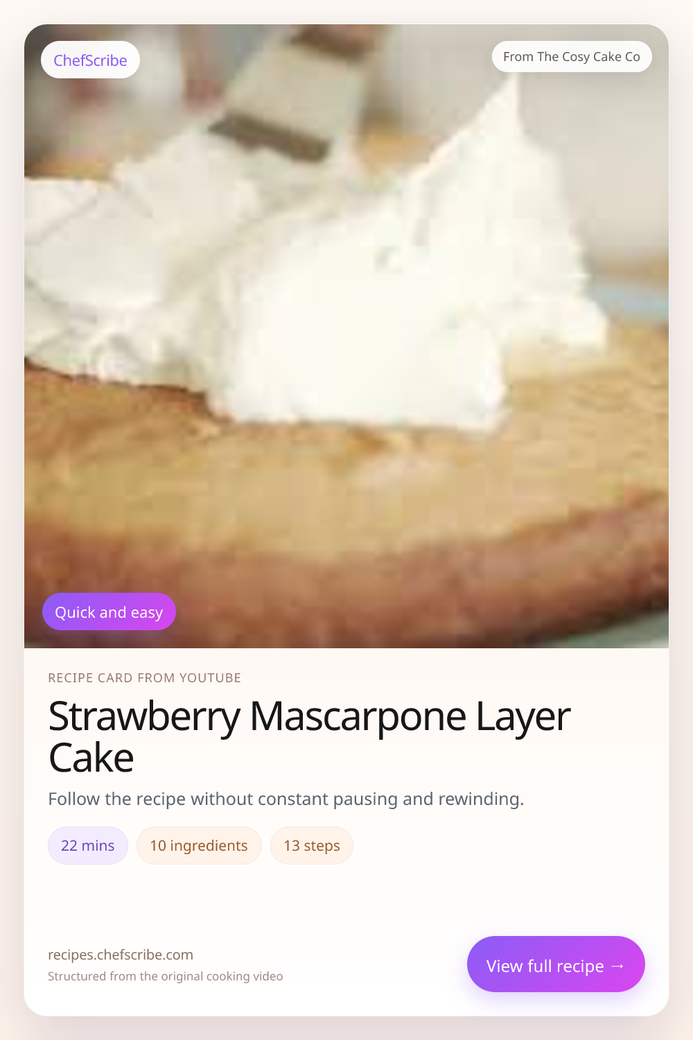 Strawberry Mascarpone Layer Cake is shown here as a structured recipe card extracted by ChefScribe from the original YouTube cooking video by The Cosy Cake Co. It is designed to make the recipe easier to follow while cooking. For the creator’s full presentation and context, watch the original video on YouTube.