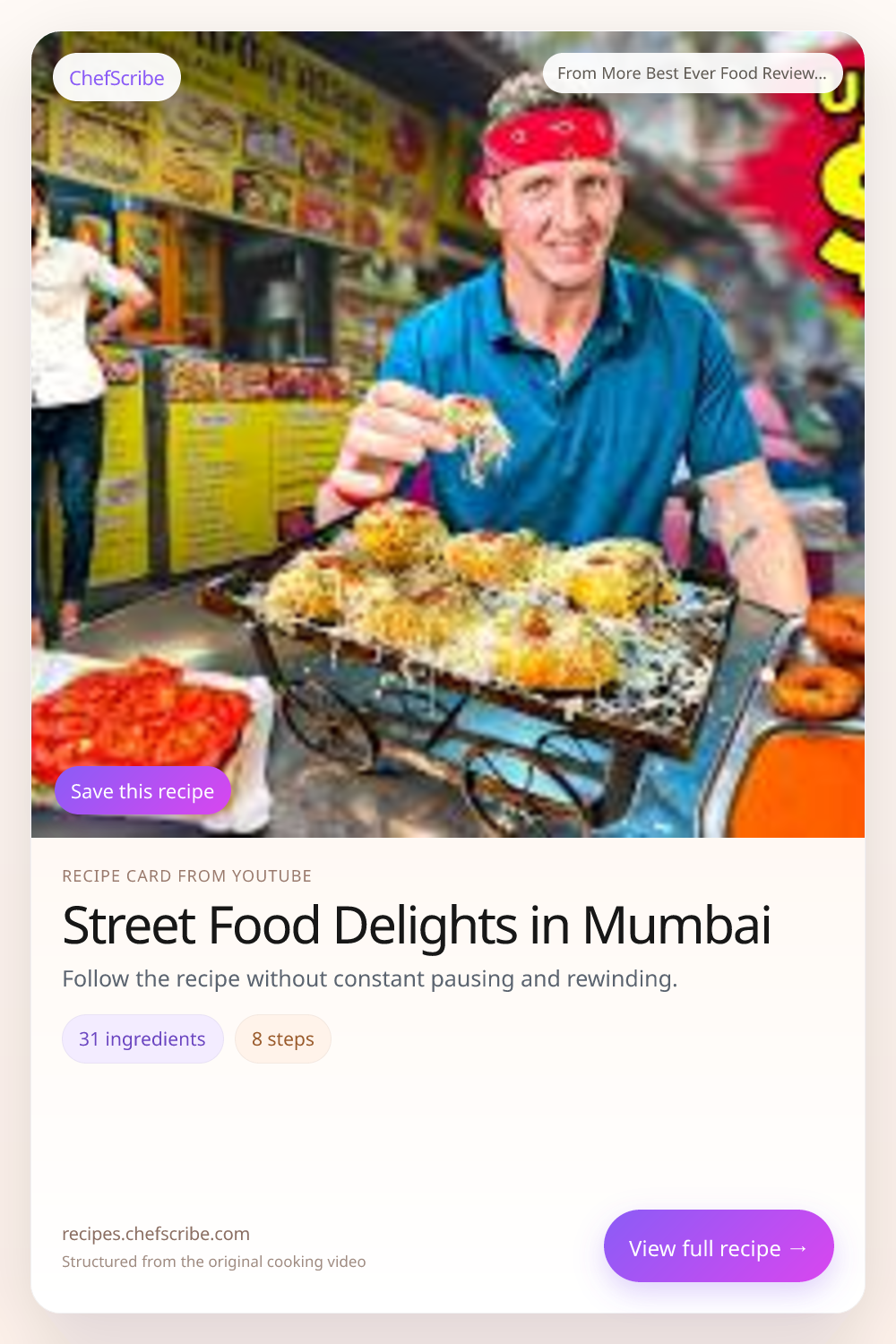 Street Food Delights in Mumbai is shown here as a structured recipe card extracted by ChefScribe from the original YouTube cooking video by More Best Ever Food Review Show. It is designed to make the recipe easier to follow while cooking. For the creator’s full presentation and context, watch the original video on YouTube.