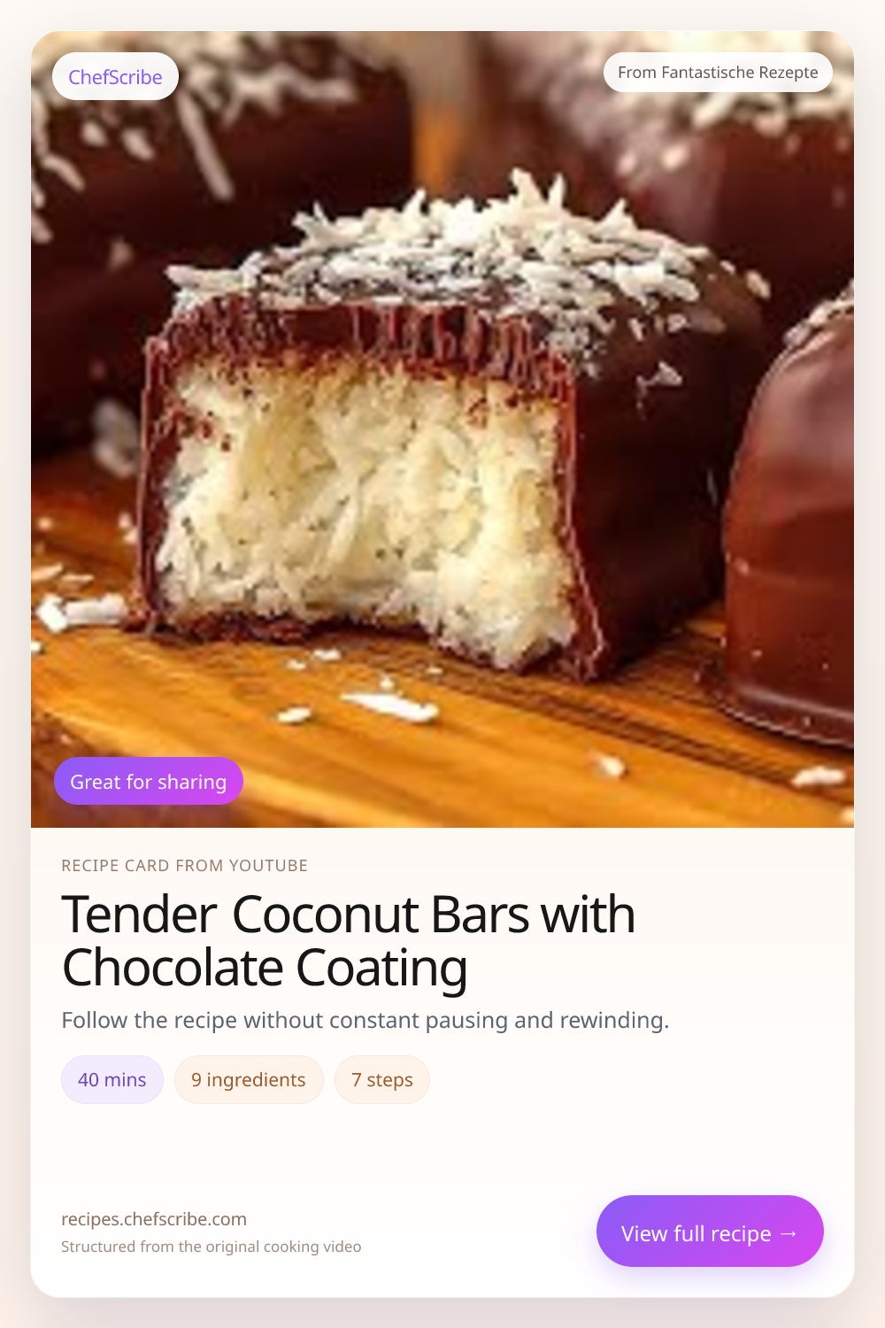 Tender Coconut Bars with Chocolate Coating is shown here as a structured recipe card extracted by ChefScribe from the original YouTube cooking video by Fantastische Rezepte. It is designed to make the recipe easier to follow while cooking. For the creator’s full presentation and context, watch the original video on YouTube.