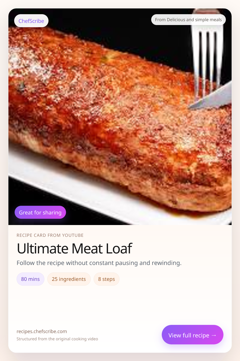 Ultimate Meat Loaf is shown here as a structured recipe card extracted by ChefScribe from the original YouTube cooking video by Delicious and simple meals. It is designed to make the recipe easier to follow while cooking. For the creator’s full presentation and context, watch the original video on YouTube.