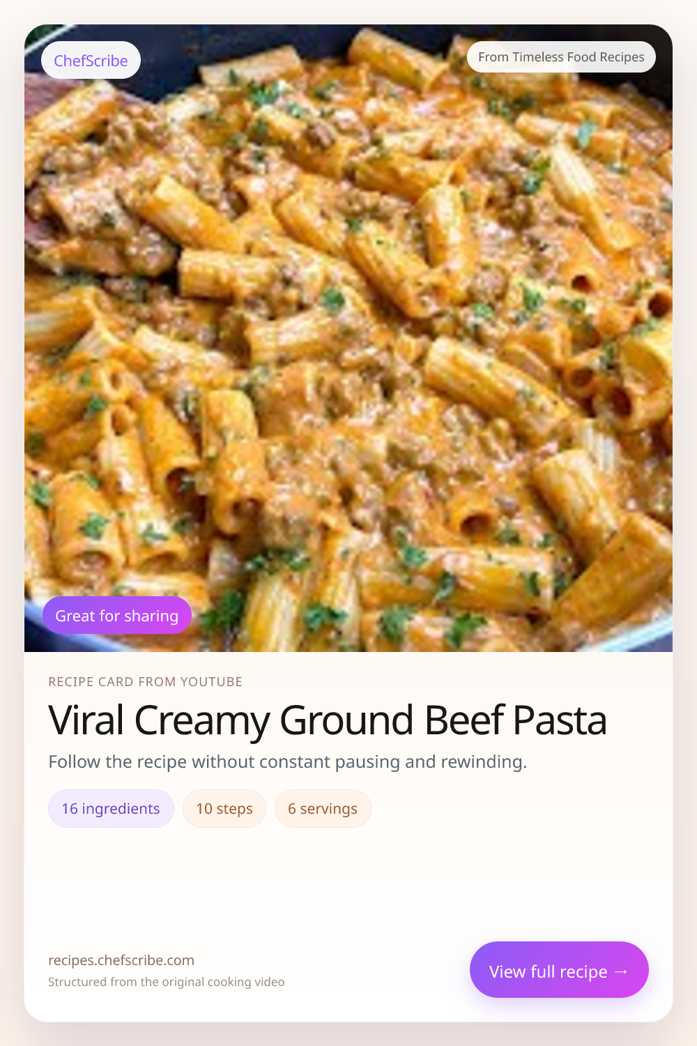 Viral Creamy Ground Beef Pasta is shown here as a structured recipe card extracted by ChefScribe from the original YouTube cooking video by Timeless Food Recipes. It is designed to make the recipe easier to follow while cooking. For the creator’s full presentation and context, watch the original video on YouTube.