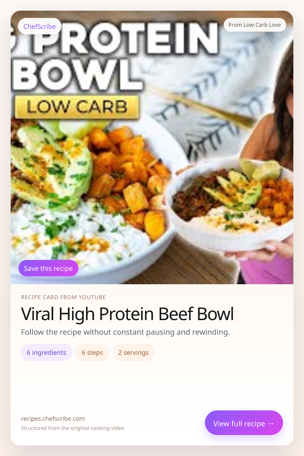 Viral High Protein Beef Bowl is shown here as a structured recipe card extracted by ChefScribe from the original YouTube cooking video by Low Carb Love. It is designed to make the recipe easier to follow while cooking. For the creator’s full presentation and context, watch the original video on YouTube.