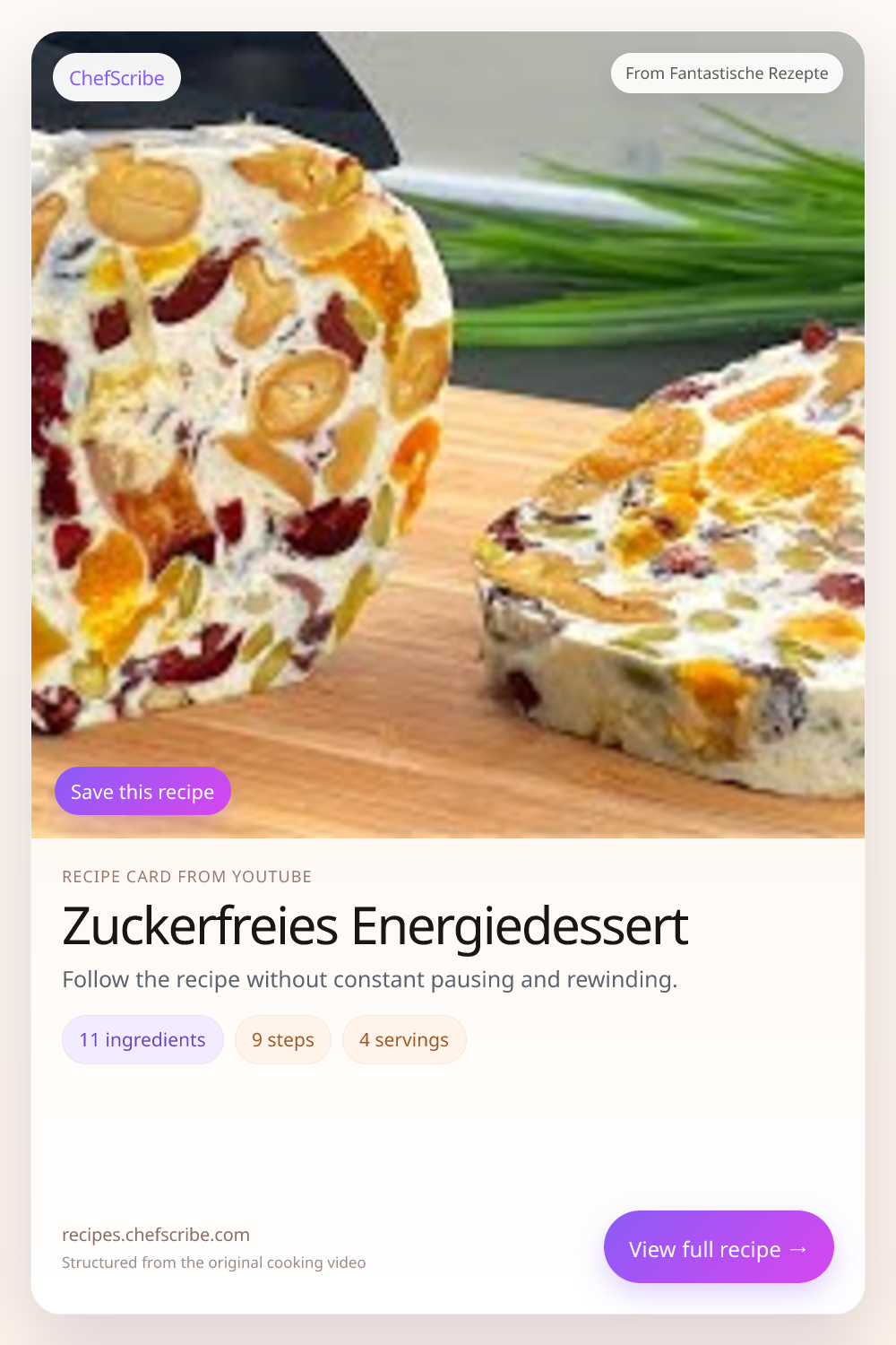 Zuckerfreies Energiedessert is shown here as a structured recipe card extracted by ChefScribe from the original YouTube cooking video by Fantastische Rezepte. It is designed to make the recipe easier to follow while cooking. For the creator’s full presentation and context, watch the original video on YouTube.